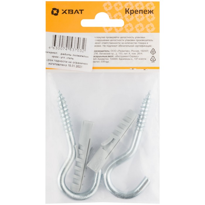 Дюбель изготовлен из полипропилена, шуруп-полукольцо - из стали. В комплекте: дюбель, шуруп-полукольцо.