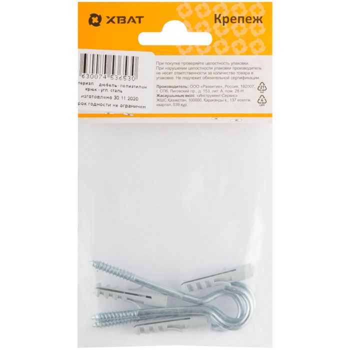 Дюбель изготовлен из полипропилена, шуруп-полукольцо - из стали. В комплекте: дюбель, шуруп-полукольцо.