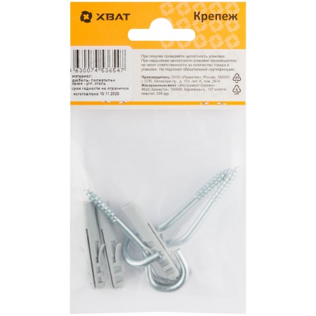 Дюбель изготовлен из полипропилена, шуруп-полукольцо - из стали. В комплекте: дюбель, шуруп-полукольцо.