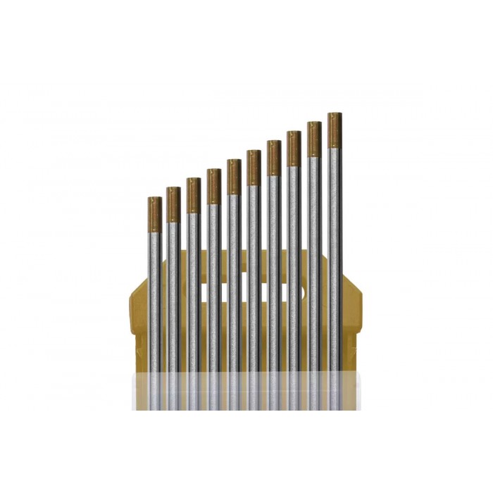 Электроды вольфрамовые WL-15, Ø 4,0 мм, цвет золотистый (цена указана за 1 электрод) из сплава вольфрама с оксидом лантана имеют очень легкий первоначальный запуск дуги, низкую склонность к прожогам, устойчивую дугу и отличную характеристику повторного зажигания дуги.