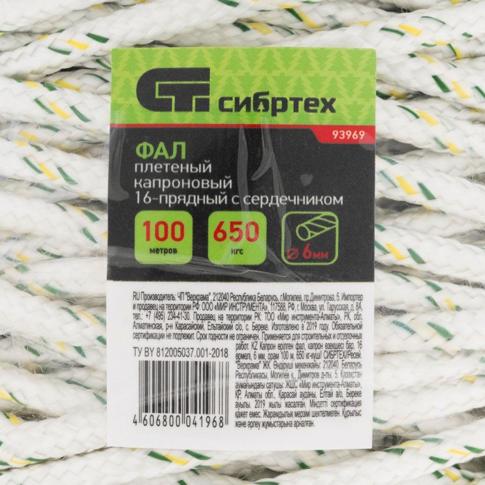 Фал плетеный капроновый с сердечником, 6 мм, L 100 м, 16-прядный, Сибртех (93969)