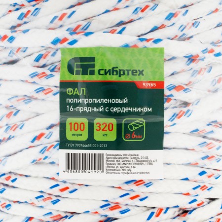 Фал плетеный полипропиленовый с сердечником, 6 мм, L100 м, 16-прядный, Сибртех (93965)