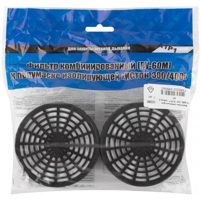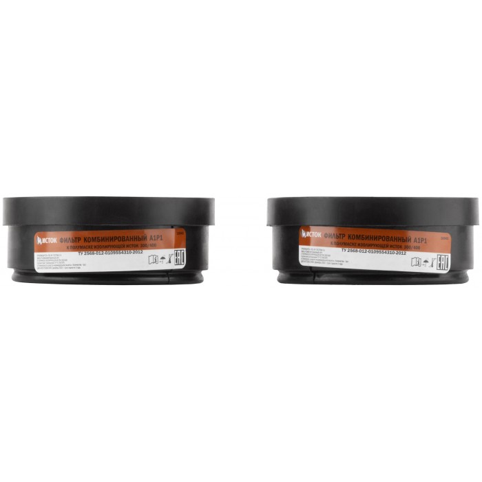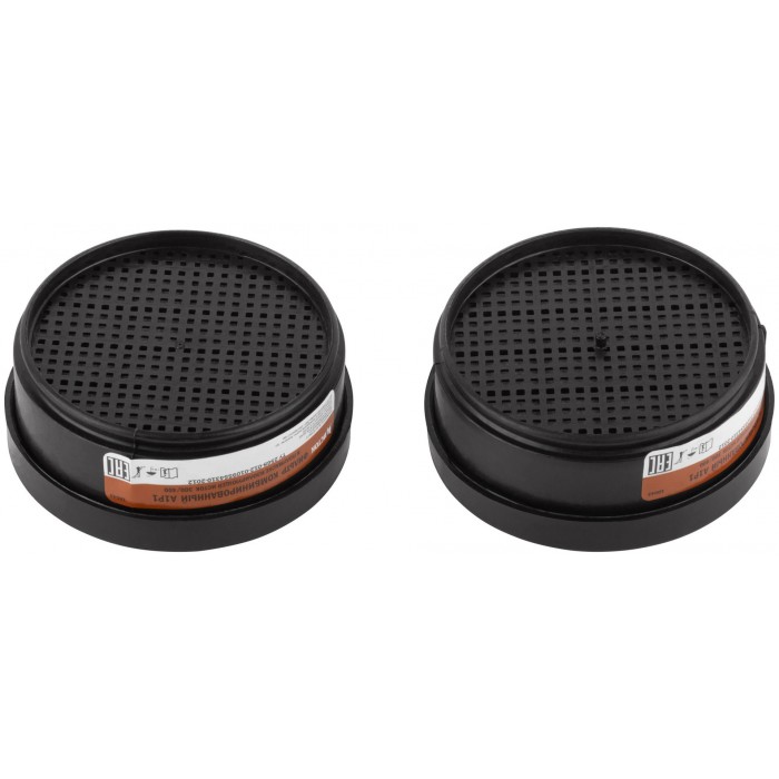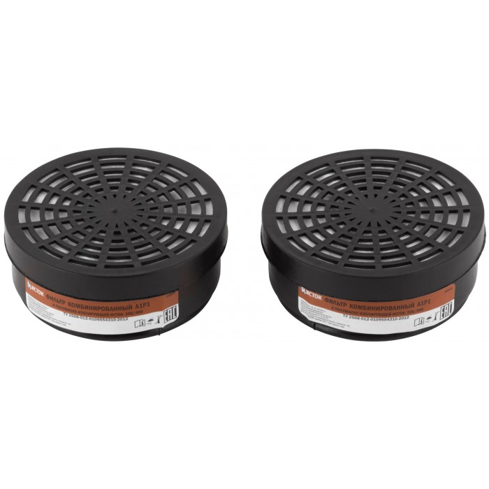 Набор 2 шт. Фильтр сменный противогазовый, для респиратора «ИСТОК-300/400» (РУ-60М) (А1Р1). Сочетает в себе две марки защиты. Марка ''А'' - защищает от органических паров или газов с температурой кипения выше 65 °С (бензин, бензол, керосин, ацетон, анилин, толуол, сероуглерод, различные спирты и эфир, и др.). Марка ''Р'' - защищает от всех видов аэрозолей (пыль, дым, туман). Материал: пластик, уголь активированный, полотно полиэфирное, полотно полипропиленовое.