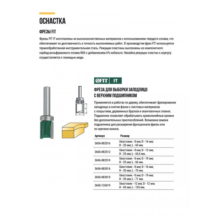 Фреза для выборки заподлицо с верхним подшипником DxHxL=16х30х70 мм (3606-083016)