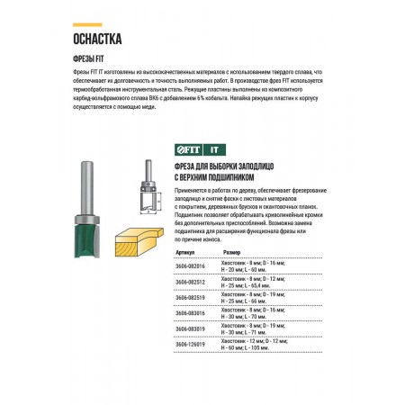 Фреза для выборки заподлицо с верхним подшипником DxHxL=19х25х66 мм (3606-082519)