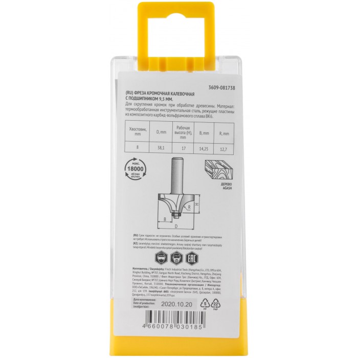 Фреза кромочная калевочная с нижним подшипником DxHxL=38,1x17x54 мм (3609-081738)