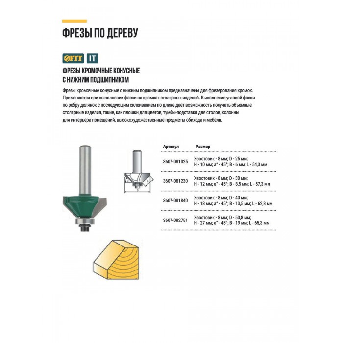 Фреза кромочная конусная с нижним подшипником DxHxL=25х10х54,3 мм (3607-081025)