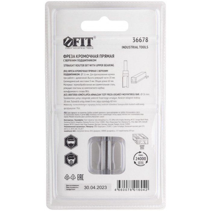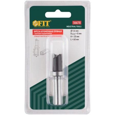 Фреза кромочная прямая с верхним подшипником, DxHxL = 16х20х60 мм (36678)