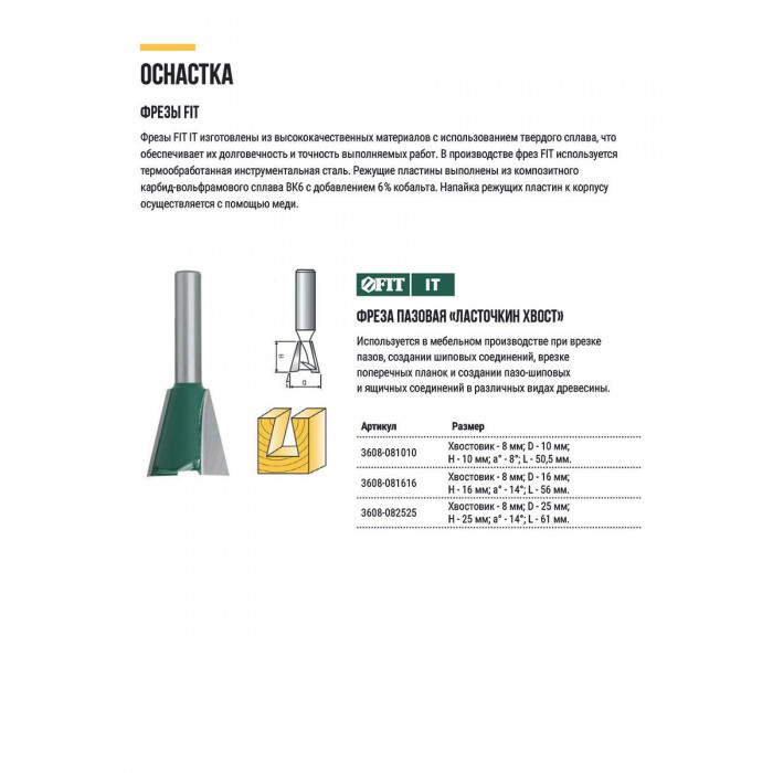 Фреза пазовая "Ласточкин хвост" DxHxL=25х25х61 мм (3608-082525)