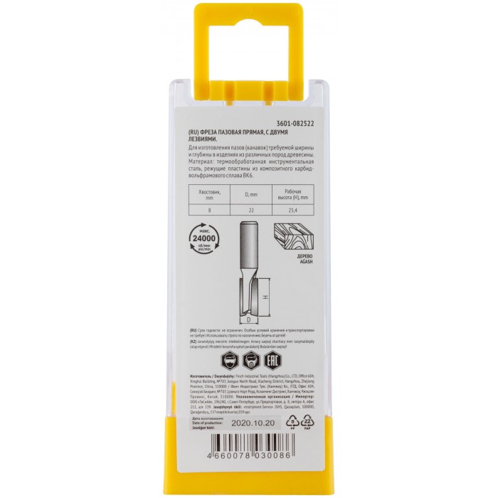 Фреза пазовая прямая с двойным лезвием DxHxL=22х25,4x60 мм (3601-082522)