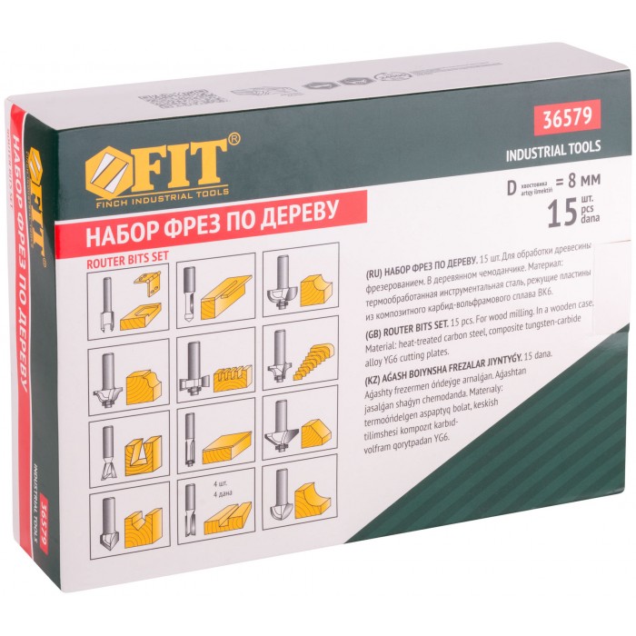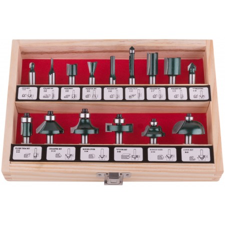 Фрезы по дереву кромочные, набор 15 шт., деревянный бокс, хвостовик 8 мм (36579)