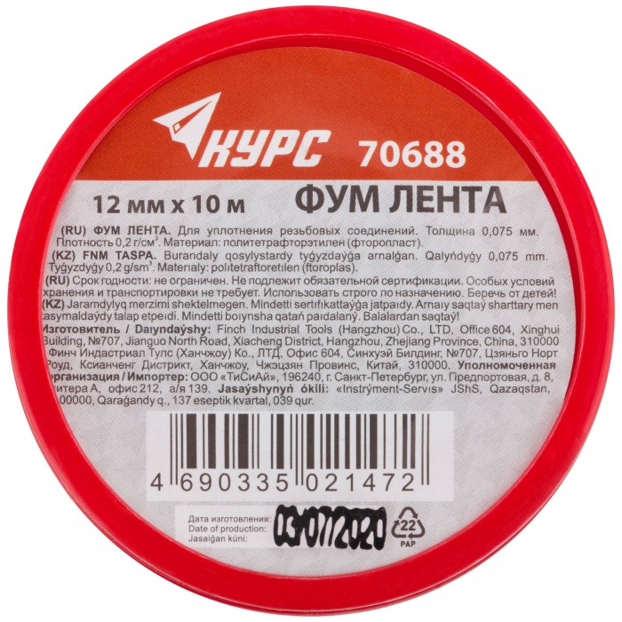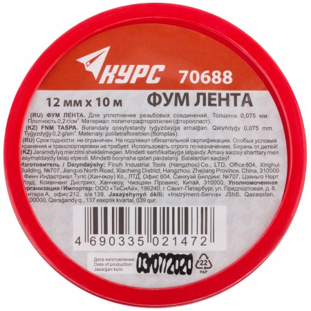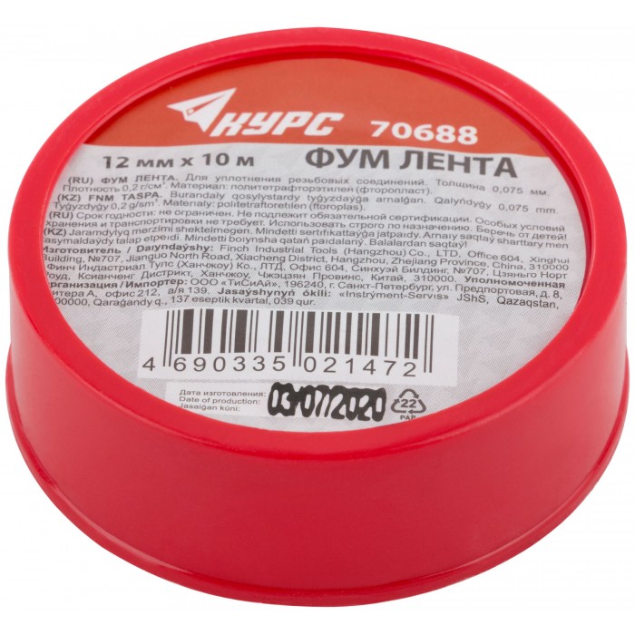 ФУМ Лента, плотность 0,2 гр/см3, 12 мм x 10 м x 0,075 мм (70688)