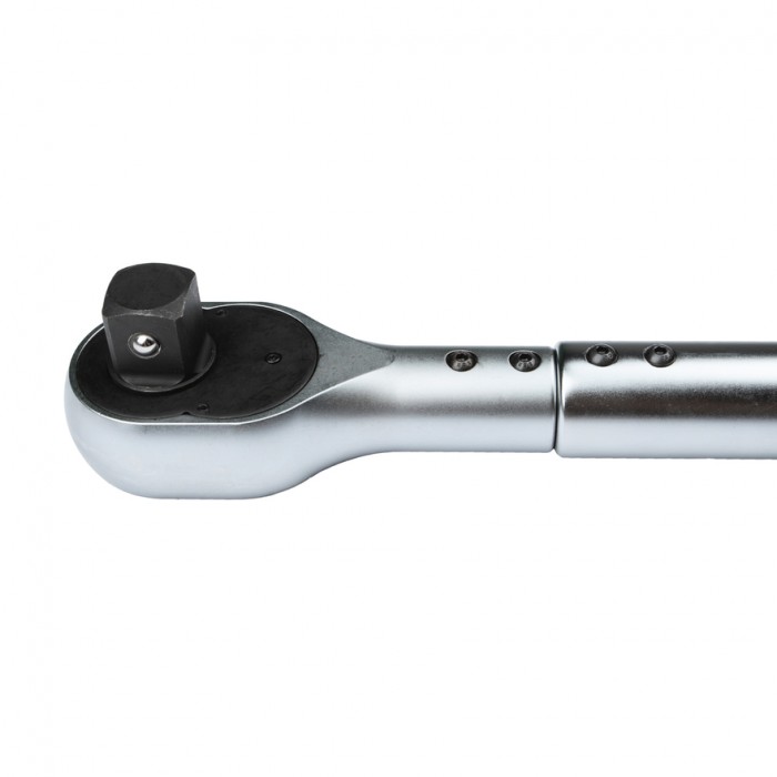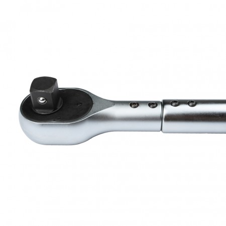 Нажимной фиксатор у верха рукоятки обеспечивает надежную блокировку установленного момента, предотвращая случайное переключение. При достижении установленного момента происходит размыкание динамометрического механизма. Оператор слышит громкий щелчок и ощущает его рукой.