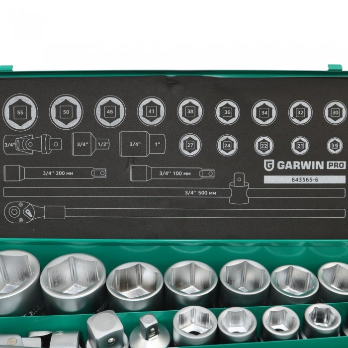 Набор торцевых головок 3/4" 6 гр., 19-55 мм, 21 пр., GARWIN PRO, 643565-6