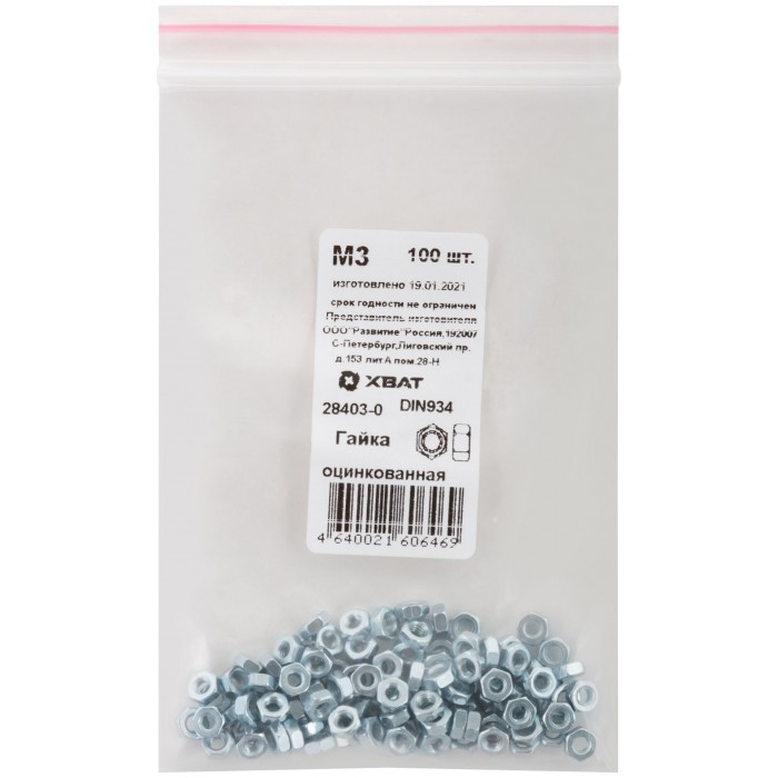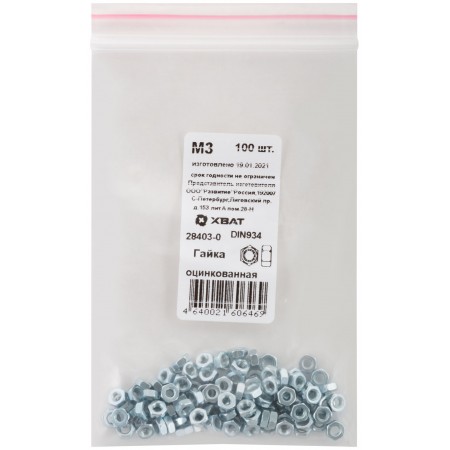 Гайка оцинкованная М3 100 шт DIN 934 Фасовка (28403-0)