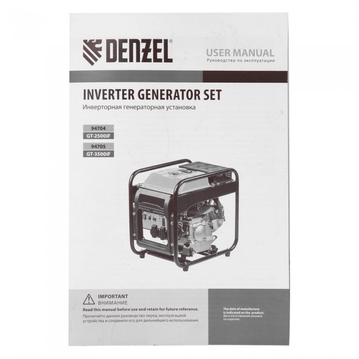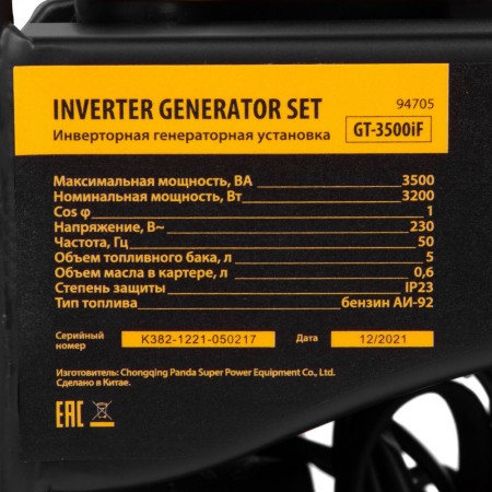 Генератор инверторный GT-3500iF, 3.5 кВт, 230 В, бак 5 л, открытый корпус, ручной старт Denzel (94705)