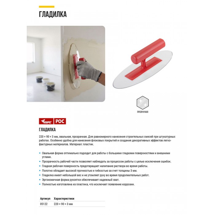 Гладилка пластиковая 220х90х3 мм, прозрачная овальная (05122)
