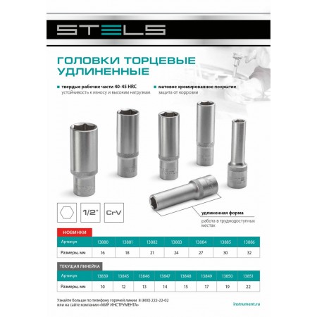 Головка торцевая удлиненная, 12 мм, шестигранная, CrV, под квадрат 1/2 Stels