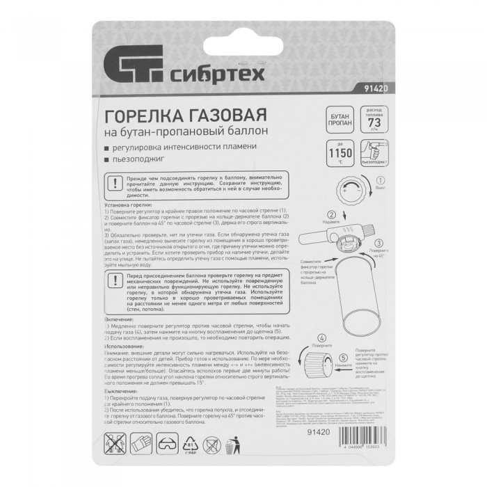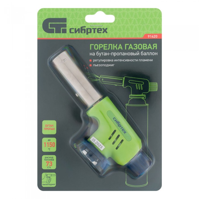 Горелка газовая на бутановый баллон, регулятор уровня пламени, пьезоподжиг Сибртех (91420)