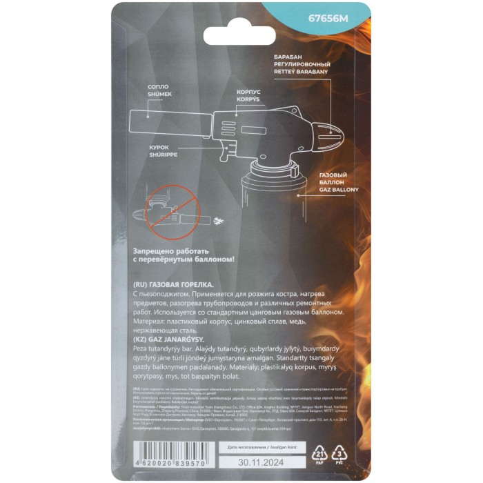 Горелка газовая на цанговый баллон, пласт.корпус, с пьезоподжигом, сопло 19 мм (67656М)