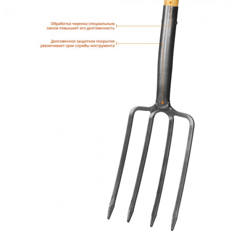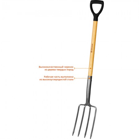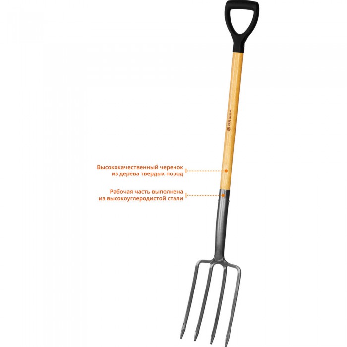 Вилы GRINDA применяются на садово-огородных участках, в сельском хозяйстве, в строительстве. Этот долговечный и функциональный инструмент изготовлен из материалов высшего качества и имеет продолжительный срок службы. Рабочая часть состоит из 4 заострённых зубцов из углеродистой стали с защитным покрытием. Прочный черенок из твёрдой древесины покрыт лаком. Для более удобного хвата на черенке имеется широкая пластиковая рукоятка. В комплект поставки входит чехол из ПВХ, обеспечивающий защиту рабочей части при хранении и транспортировке.