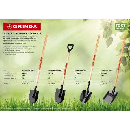 Лопата штыковая тип ЛСГ 290 х 215 х 1500 мм, полотно 1.6 мм, закалено, деревянный черенок высш. сорт GRINDA 421824