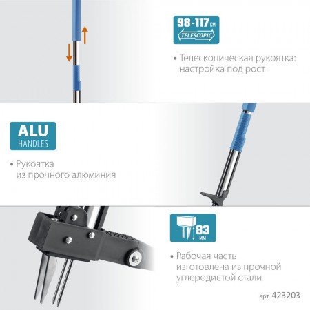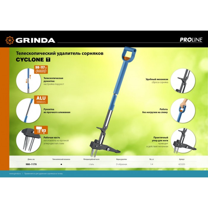 Телескопический удалитель сорняков CYCLONE-T, длина 980 - 1170 мм, алюминиевый корпус, пластиковая D-образная рукоятка, PROLine GRINDA 423203