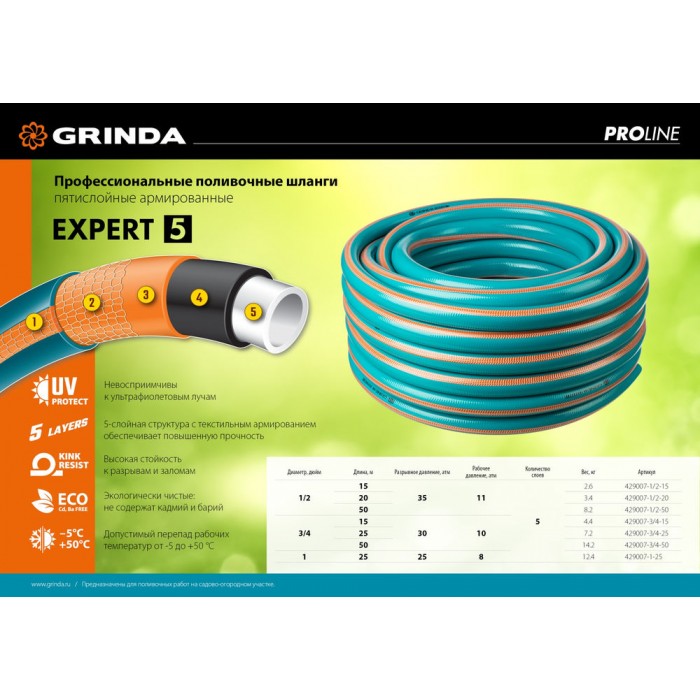 Профессиональные шланги серии GRINDA PRO-LINE EXPERT 5 отличаются особой прочностью и надёжностью. При этом сохраняют гибкость и эластичность в широчайшем температурном диапазоне. Не перегибаются и не перекручиваются при использовании. Защищены от ультрафиолетовых лучей и не содержат вредных для окружающей среды тяжёлых металлов.