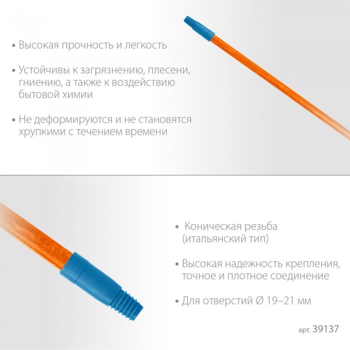 Черенок с чрезвычайно лёгким весом для для максимального комфорта в работе. Обладает высокой прочностью, очень долговечен. Используется в качестве ручки для щёток.