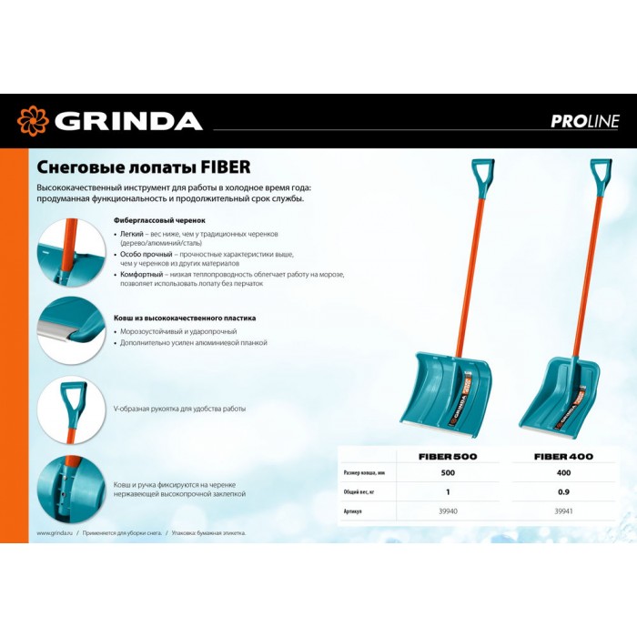 Снеговая лопата FIBER-400, фиберглассовый черенок, пластиковый ковш 400мм GRINDA 39941