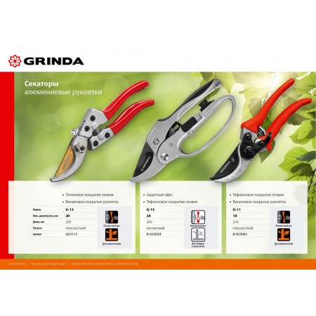Все секаторы GRINDA являются прочными, долговечными и удобными изделиями, обеспечивая комфортный и лёгкий рез. Они выполнены из высококачественных материалов гарантирующих долгий срок эксплуатации.