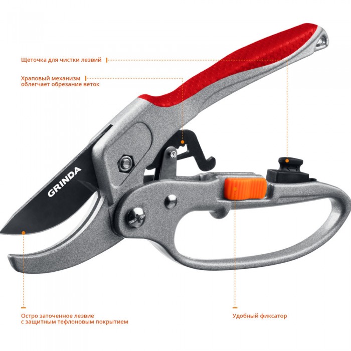 Контактный секатор G-15, 200 мм, стальные лезвия, храповый механизм, с эфесом, с алюминиевыми рукоятками GRINDA 8-423034_z01