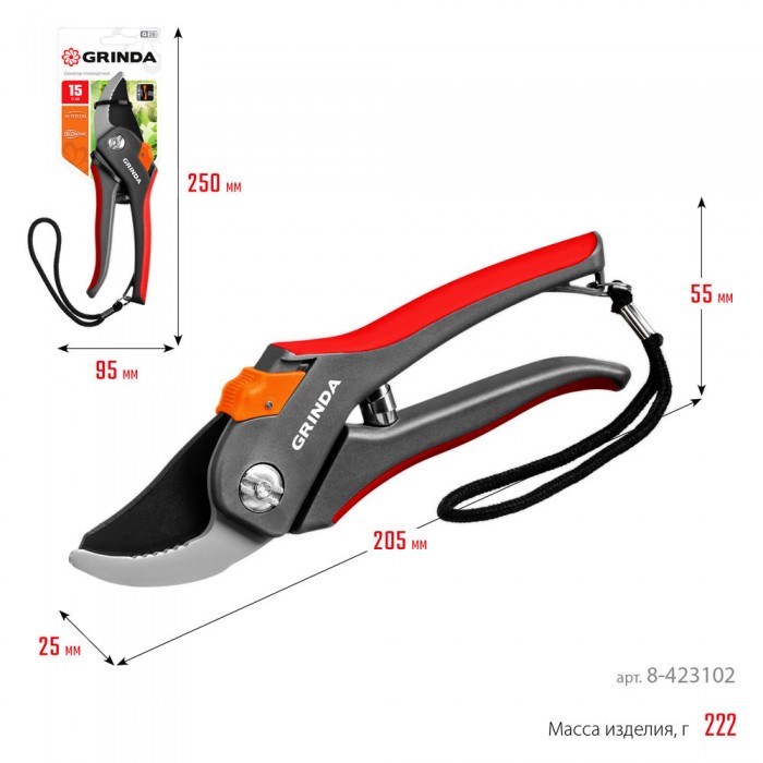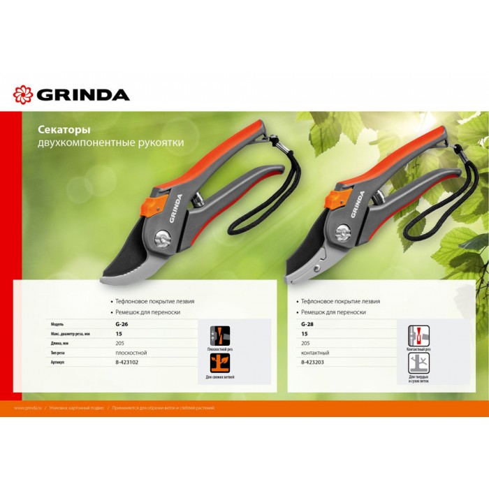 Все секаторы GRINDA являются прочными, долговечными и удобными изделиями, обеспечивая комфортный и лёгкий рез. Они выполнены из высококачественных материалов гарантирующих долгий срок эксплуатации.
