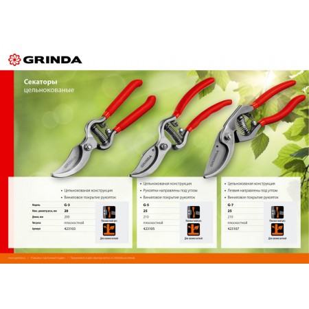 Все секаторы GRINDA являются прочными, долговечными и удобными изделиями, обеспечивая комфортный и лёгкий рез. Они выполнены из высококачественных материалов гарантирующих долгий срок эксплуатации.