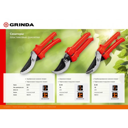 Все секаторы GRINDA являются прочными, долговечными и удобными изделиями, обеспечивая комфортный и лёгкий рез. Они выполнены из высококачественных материалов гарантирующих долгий срок эксплуатации.