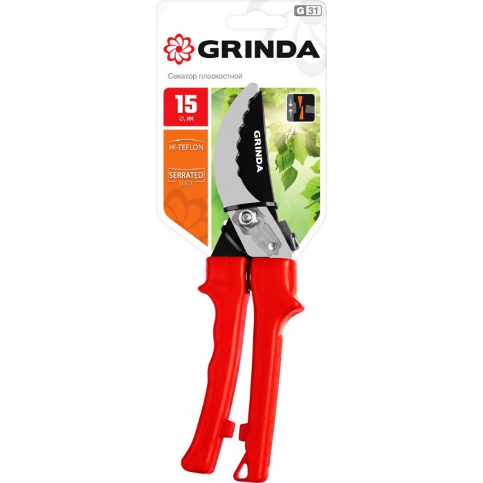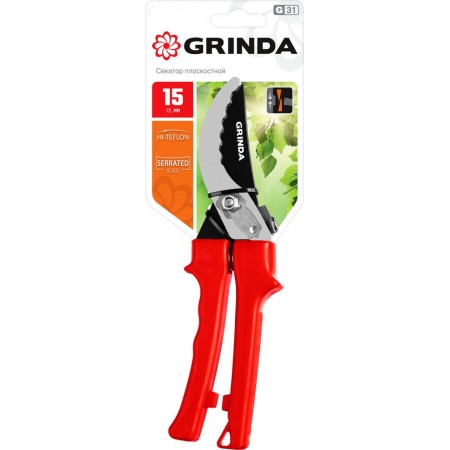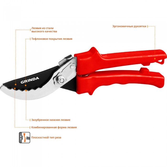 Плоскостной секатор G-31, 200 мм, закаленные лезвия, тефлоновое покрытие, зубцы на лезвии, пластиковые рукоятки GRINDA 40210_z02