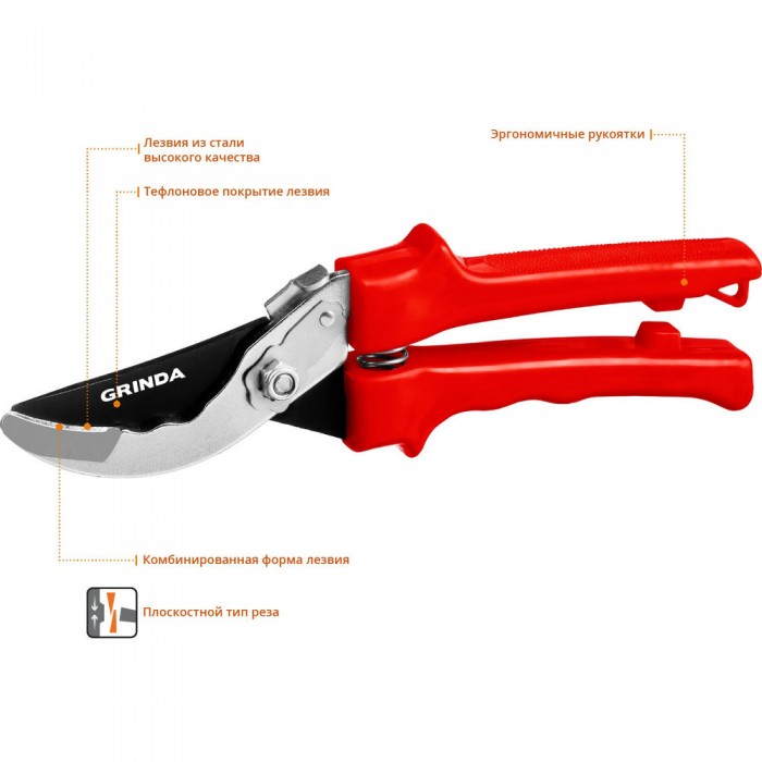 Все секаторы GRINDA являются прочными, долговечными и удобными изделиями, обеспечивая комфортный и лёгкий рез. Они выполнены из высококачественных материалов гарантирующих долгий срок эксплуатации.