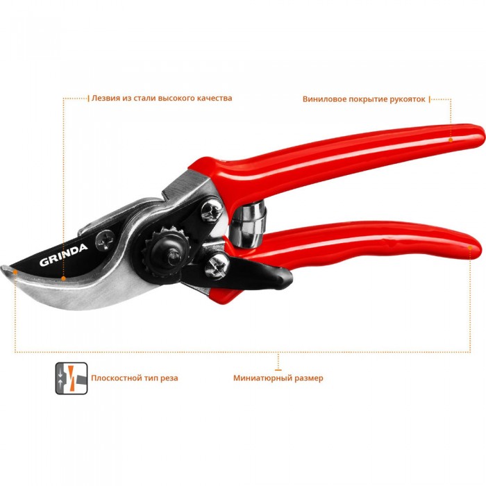Все секаторы GRINDA являются прочными, долговечными и удобными изделиями, обеспечивая комфортный и лёгкий рез. Они выполнены из высококачественных материалов гарантирующих долгий срок эксплуатации.