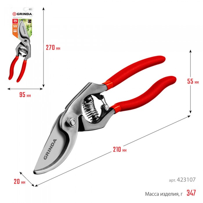Плоскостной секатор G-7, 210 мм, высокоуглеродистая сталь, направленное под углом лезвие, цельнокованый, покрытие ПВХ GRINDA 423107