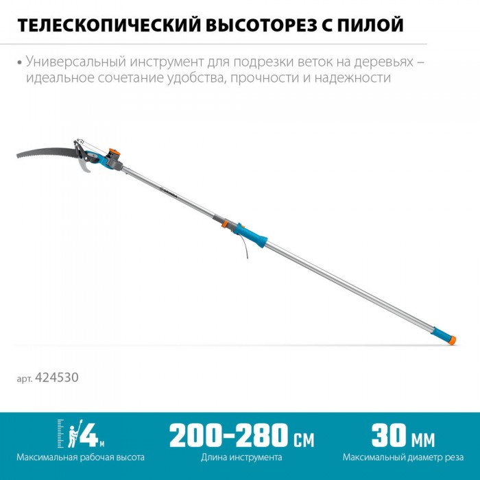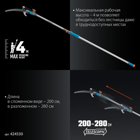 Телескопический высоторез с пилой GX-4000, длина 2-2,8 м, пила 350мм, рез до 30 мм, лезвия из нержавеющей стали, PROLine GRINDA 424530
