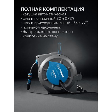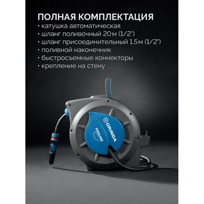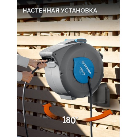 Поливочный набор с автоматической катушкой для шланга GRINDA обеспечивают удобство хранения и транспортировки поливочной системы. Удобство при поливе. Инерционный механизм позволяе быстро убрать шланг без спутывания. Крепление к стене на поворотный кронштейн позволяет поливать более удобным способом. Специально разработанные системы соединения и направляющих предохраняют шланг от перегибов и перекручивания, продлевая тем самым срок его службы и сохраняя первоначальные свойства.