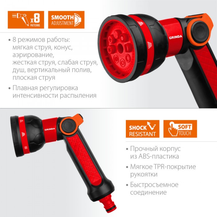 Поливочные пистолеты-распылители GRINDA удобны, надёжны и долговечны. Обеспечивают простое и качественное подключение к поливочной системе. Широкий модельный ряд с самыми современными и эффективными режимами полива.