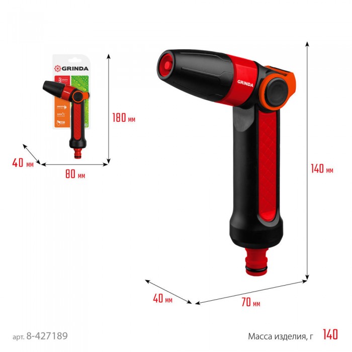 Поливочные пистолеты-распылители GRINDA удобны, надёжны и долговечны. Обеспечивают простое и качественное подключение к поливочной системе. Широкий модельный ряд с самыми современными и эффективными режимами полива.