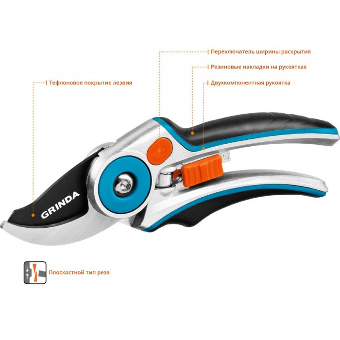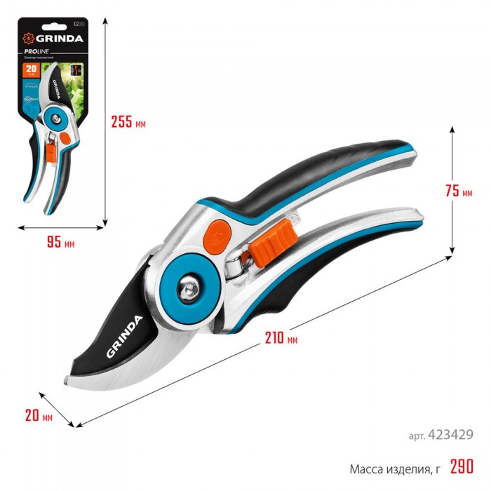 Плоскостной секатор P-29, 210 мм, закаленная сталь, усиленная конструкция с эргономичными алюминиевыми рукоятками, PROLine GRINDA 423429