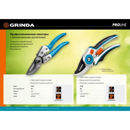 Профессиональные секаторы GRINDA PRO-LINE характеризуются самыми надёжными и современными материалами. Пользуясь этими секаторами вы обеспечите себе удовольствие и комфорт при работах в саду.