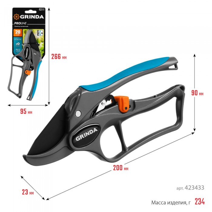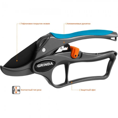 Контактный секатор P-33, 200 мм, закаленная сталь, с храповым механизмом, алюминиевые рукоятки с эфесом, PROLine GRINDA 423433