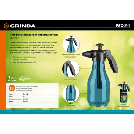 Ручной опрыскиватель PH-1.5, 1.5 л, колба из полиэтилена, возможность работы под любым углом, PROLine GRINDA 425055_z01