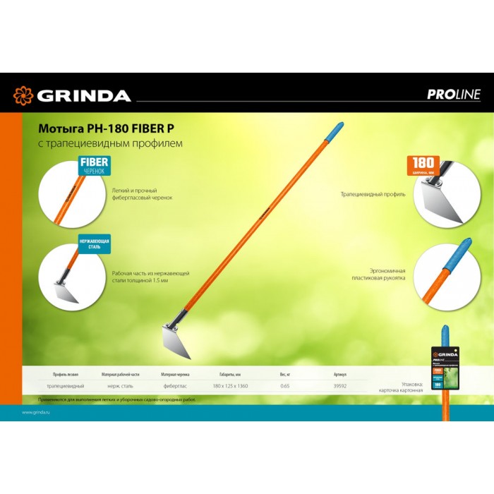 Мотыга PH-180 FIBER, 180 х 125 х 1360 мм, нержавеющая сталь, трапециевидный профиль, фибергласовый черенок, PROLine GRINDA 39592