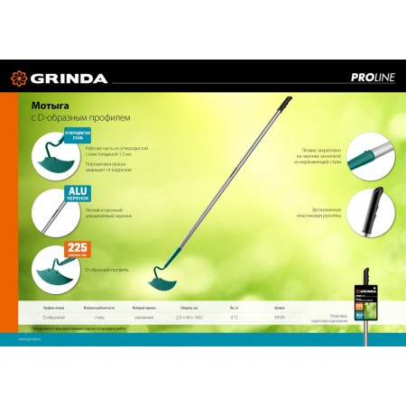 Мотыга PH-225 ALU, 225 х 80 х 1465 мм, D-образный профиль, углеродистая сталь, антикор. покрытие, алюминиевый черенок, PROLine GRINDA 39599