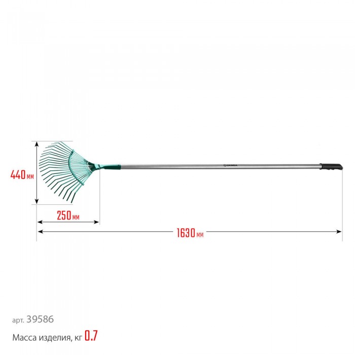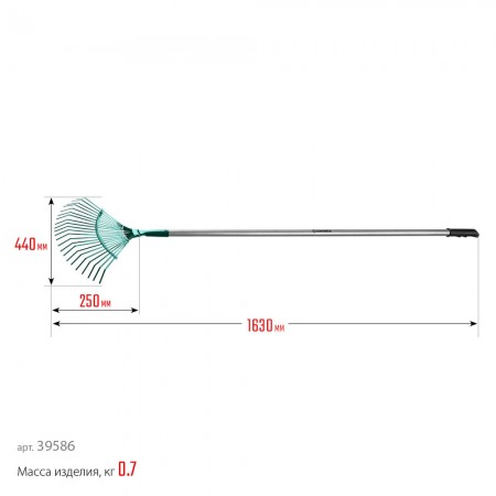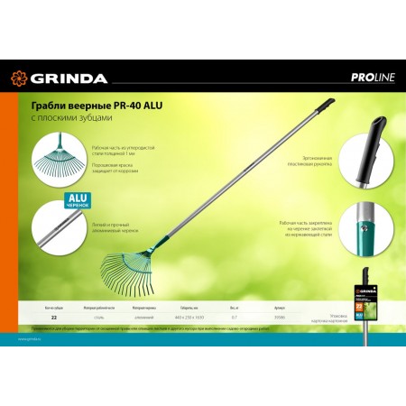 Веерные грабли PR-40 ALU, 440 х 250 х 1630 мм, 22 плоских зубца, алюминиевый черенок, PROLine GRINDA 39586